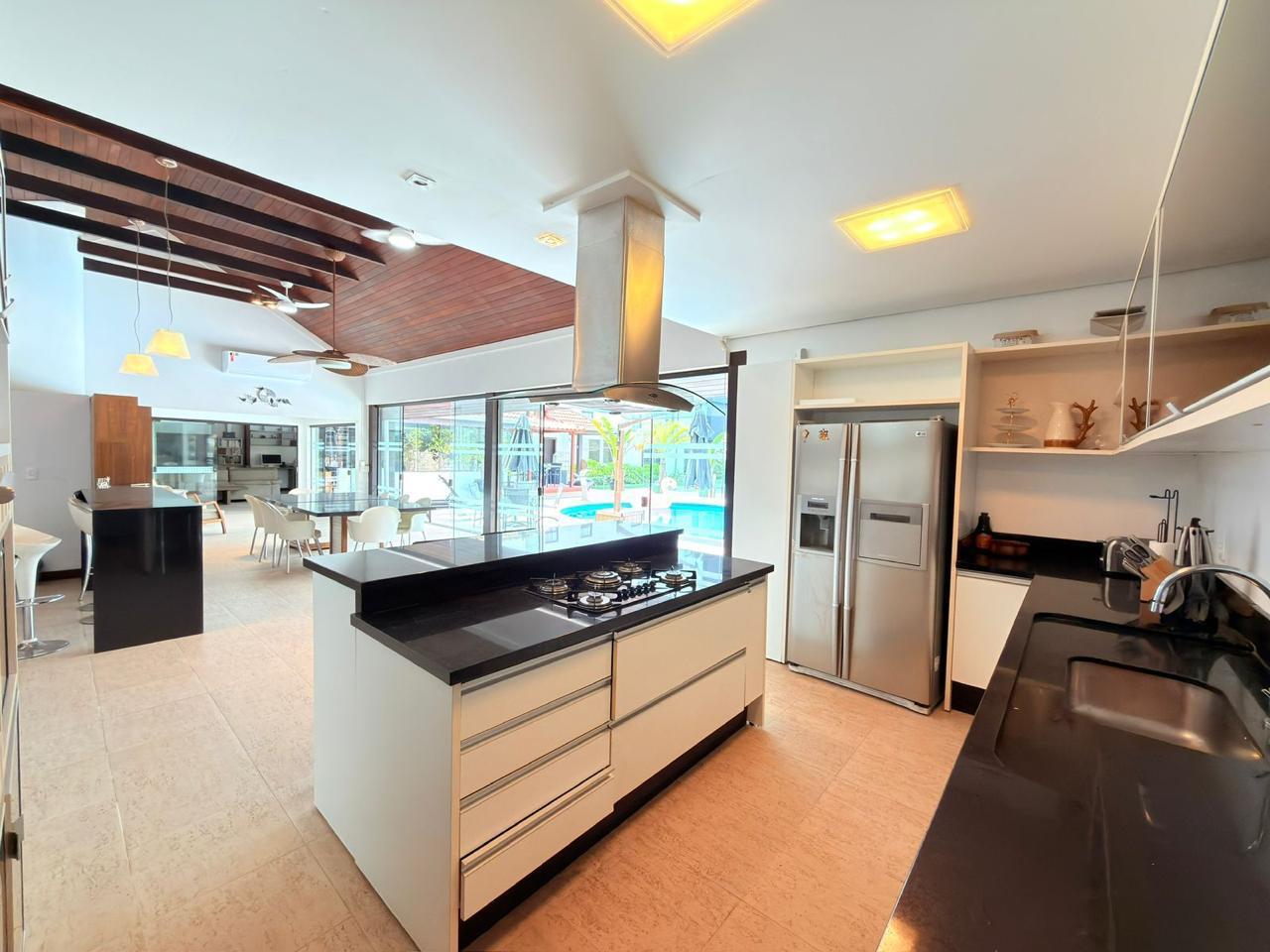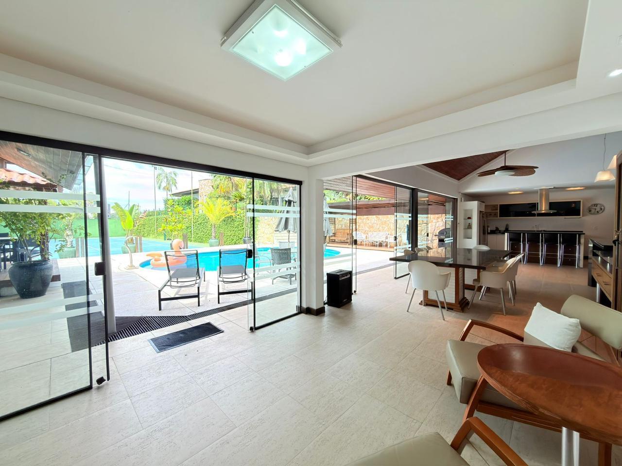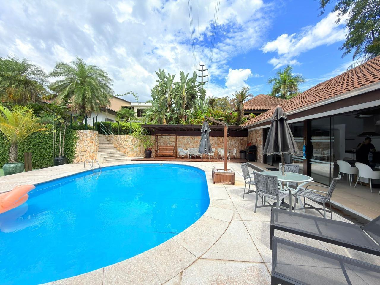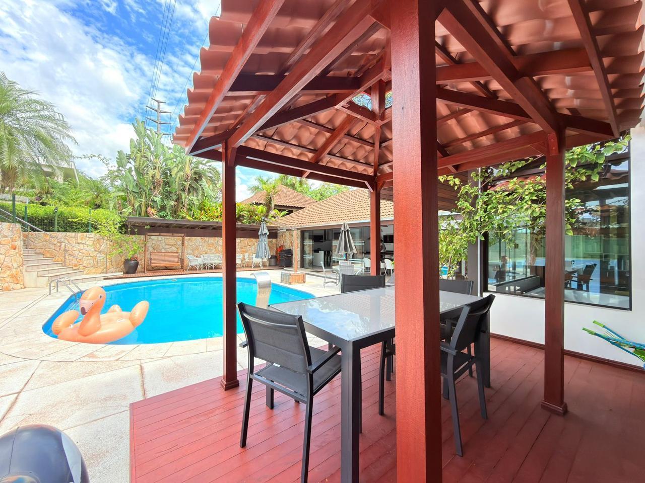 A residência possui aproximadamente 370m² de área construída, distribuídos entre a casa principal e uma ampla área de festas, com ambientes pensados para proporcionar momentos únicos com família e amigos.