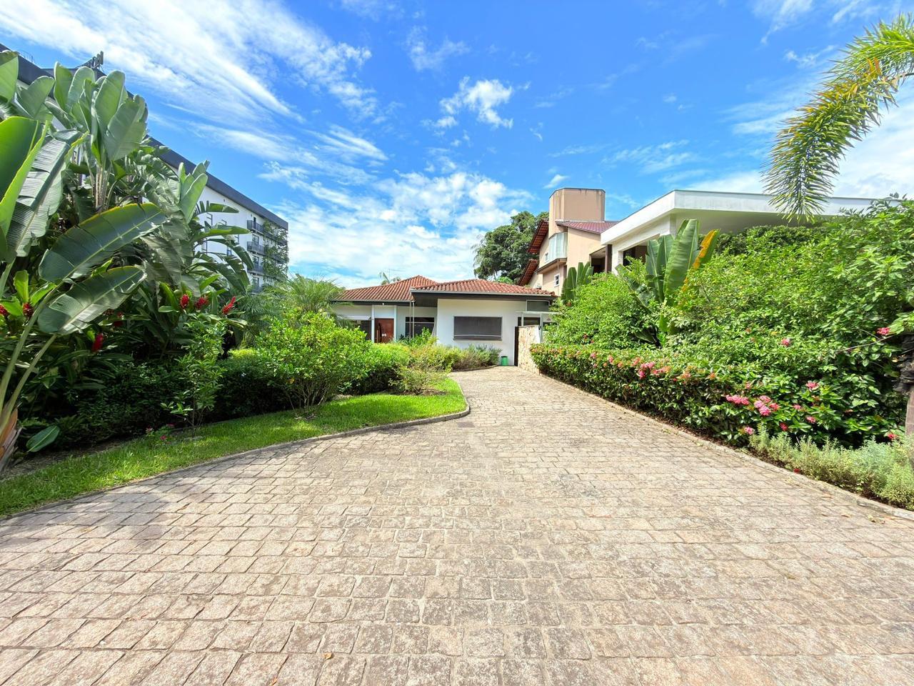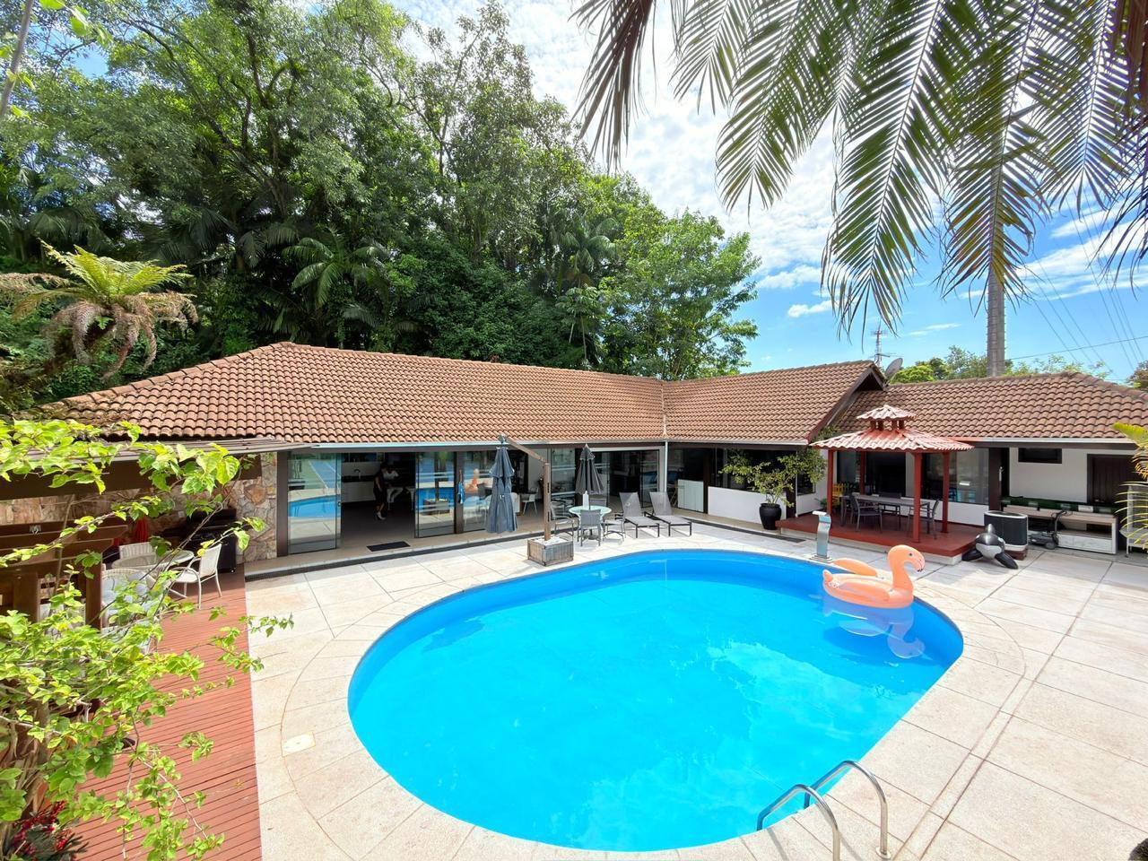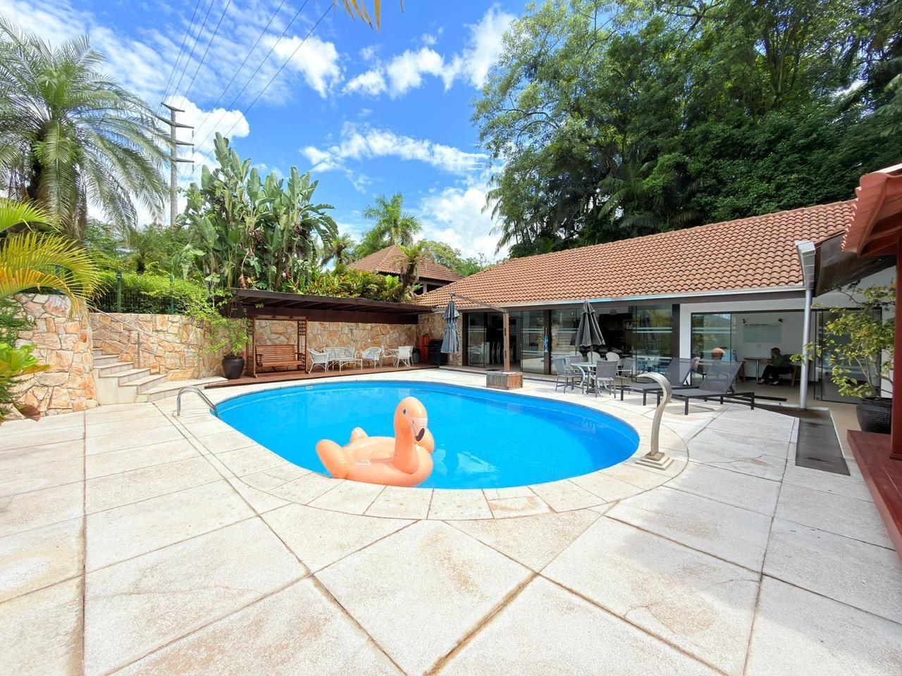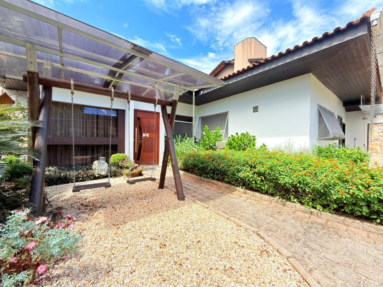 A residência possui aproximadamente 370m² de área construída, distribuídos entre a casa principal e uma ampla área de festas, com ambientes pensados para proporcionar momentos únicos com família e amigos.